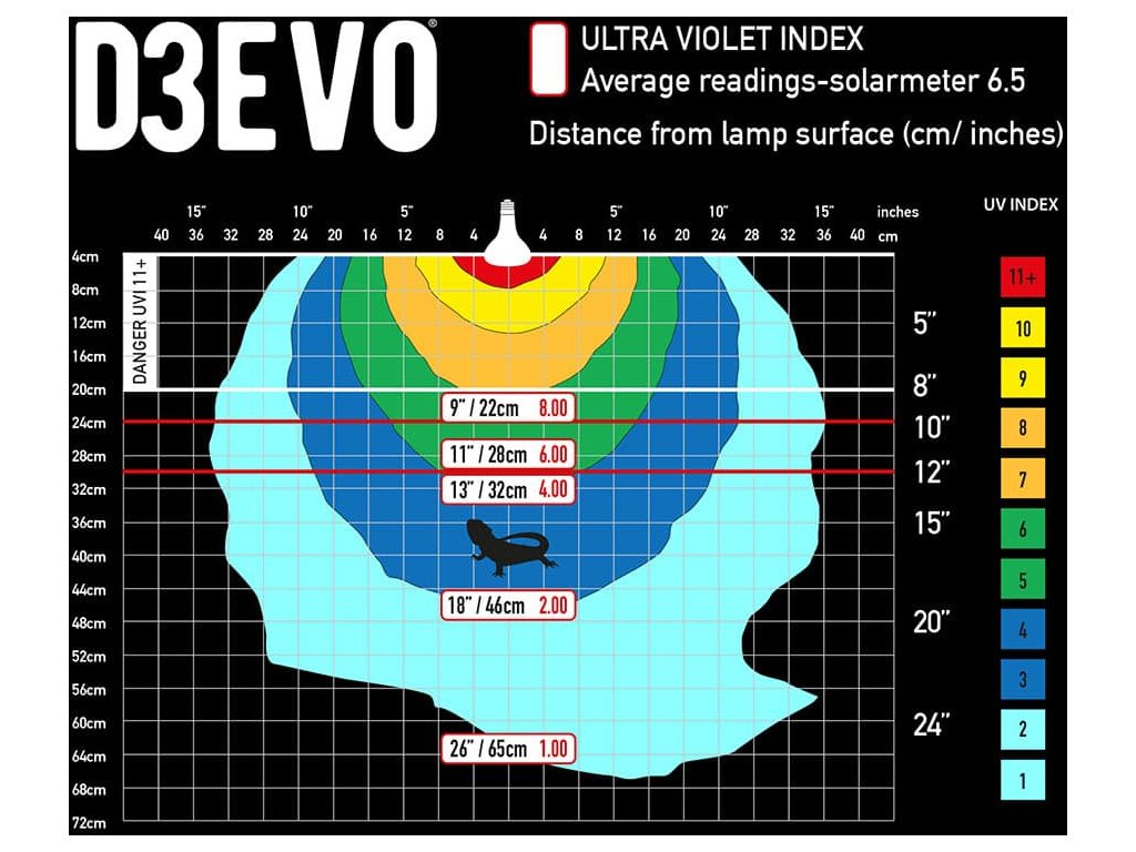 Doporučená minimální vzdálenost od zvířete je u nové výbojky 35-40 cm. Minimální výška terária 55 cm a více.