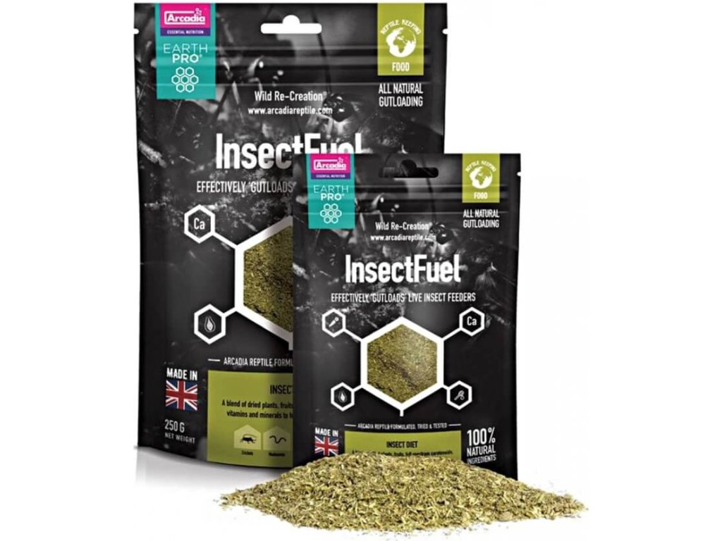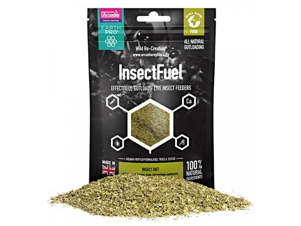 Krmivo pro krmný hmyz Arcadia EarthPRO-Insect Fuel má svůj základ ve vojtěšce, pěstované a sklízené v Anglii, obohacené o plné spektrum vitamínů, minerálů a včelího pylu. Směs Insect Fuel je určená pro zkrmování živému hmyzu – cvrčkům, sarančatům, švábům, moučným červům a zophobasům. Doporučujeme jim tuto směs nabízet několik dnů předtím, než bude hmyz zkrmován plazům. Tak zajistíte, že vaši plazi budou konzumovat plnohodnotné živé krmivo. Tento způsob krmení hmyzu se označuje jako gutloading.